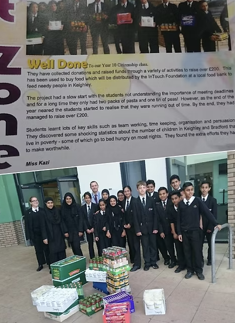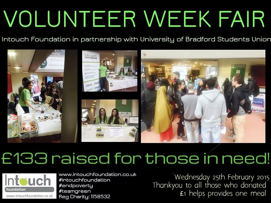 In July 2015, the InTouch Foundation organised several activities: On Saturday, 11 July, children aged 4 to teenagers from the Al-Hadiya Islamic School in Leeds raised £3,000 for the foundation to assist homeless individuals and those in need; on 12 July, members of the Islamic Church in Desbury raised £435; on 16 July, Year 11 students from Keighley University College, led by Mr. Dering and Miss Kazi, raised over £200 to purchase food for the foundation's food bank; on the same day, volunteer Bilal Shah, upon learning about the situation of autistic child Matthew, collaborated with the foundation to launch a ‘Birthday Card Fundraiser’ to ensure Matthew's fourth birthday was not spent alone; during the last two weeks of July, on Fridays, Saturdays, , from 7:30 PM to 10:30 PM, a Ramadan donation drive was held in Simlas (Bradford) to collect food for the food bank. The fundraising team raised over £1,500 for those in need within six days, with volunteers continuing their outdoor fundraising efforts during the fasting period.