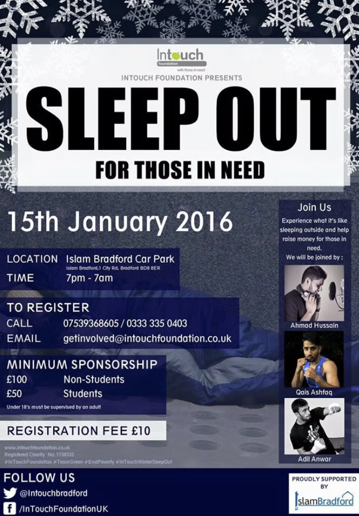 In January 2016, experience sleeping rough at the Islamic Bradford Car Park (1 City Rd, Bradford BD8 8ER). A £10 registration fee is required. Students must raise a minimum of £50 in sponsorship, while non-students must raise a minimum of £100. Those under 18 must be accompanied by an adult.